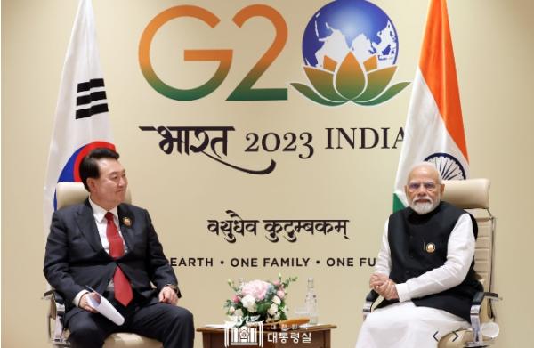 [중앙뉴스라인, 우제헌기자] G20 정상회의 참석을 위해 인도 뉴델리를 방문 중인 윤석열 대통령은 오늘(현지시간 9. 10, 일) '나렌드라 모디(Narendra Modi)' 인도 총리와 정상회담을 가졌다.
