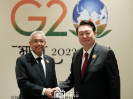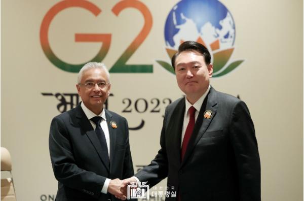 [중앙뉴스라인, 우제헌기자] G20 정상회의 참석을 위해 인도 뉴델리를 방문 중인 윤석열 대통령은 오늘 (9. 10 일, 현지시간) 오후 '프라빈드 쿠마르 저그노스(Pravind Kumar Jugnauth)' 모리셔스 총리와 정상회담을 가졌다.