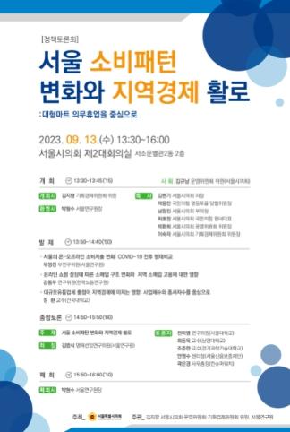 한편, 서울시의회는 김지향의원과 서울연구원 공동 주관으로 9월 13일(수) 오후 1시 30분부터 의원회관 2층 대회의실에서 연구결과에 따른 후속 조치로 유통 분야 전문가들이 참여하는 “서울 소비패턴 변화와 지역경제 활로: 대형마트 의무휴업을 중심으로” 토론회를 개최한다.