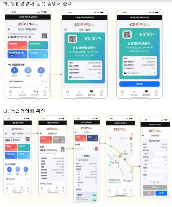 농식품부는 1단계 시스템의 미래상을 미리 체험해 볼 수 있도록 ‘2023 대한민국 농업박람회” 기간 중 ‘농업이(e)지 원패스’ 시연회를 개최한다. 이번 시연회는 가상의 농업인에 대한 경영체 등록, 지리정보시스템(GIS) 기반 내 농지 확인, 마이데이터 연동을 통한 보조금 지원이력 확인 등 각종 서비스를 스마트폰 어플리케이션 형태로 체험해 볼 수 있다. 또한 2차원 바코드를 통해 모바일 농업경영체 증명서를 다운로드해 볼 수 있다.