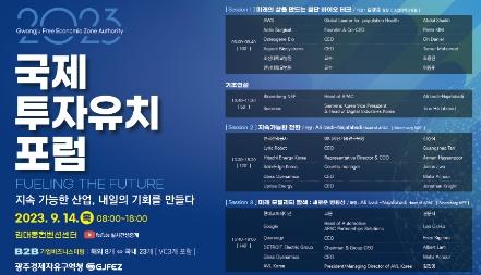 광주경제자유구역청은 글로벌 산업트렌드의 새로운 방향성을 전망하고 관련 기업들의 비즈니스협력 기회의 장인 ‘2023 국제투자유치포럼’을 14일 김대중컨벤션센터에서 개최한다.