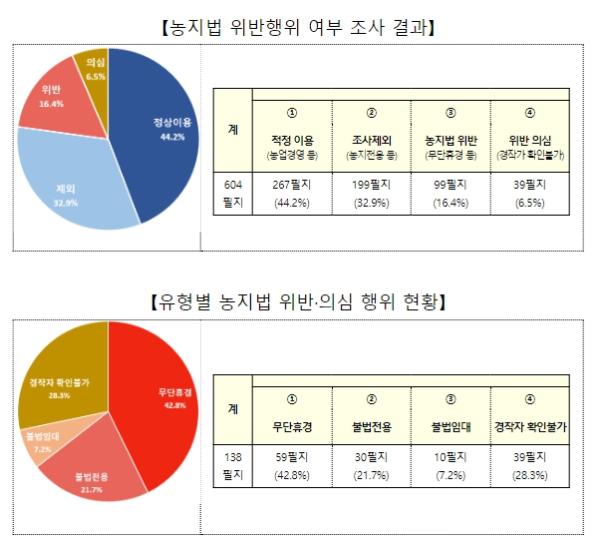 조사과정에서 농지전용 및 소유권 이전 등이 확인된 199필지 외 나머지 필지 중 267(44.2%)필지에서 직접 농업경영이 이루어지거나 정상적인 농지 임대 등으로 적정 이용 중이었으며, 138필지(22.9%)에서 무단 휴경, 불법전용 등 농지법 위반행위가 적발되거나 위반 의심 정황이 포착됐다.