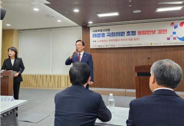 이날 강연회는 서울시의회가 주최하고 통일안보포럼이 주관했으며, 김혜영 의원(통일안보포럼 간사, 국민의힘, 광진4)이 사회를 맡아 진행했다. 서울시의회 김현기 의장과 남창진 부의장이 축사 후 태영호 국회의원(국민의힘, 강남갑)이 ‘김정은의 남한 점령 가능한가’라는 주제로 강연을 했고, 의원연구단체 회원의원 및 서울시의회 의원들과 통일안보에 관심이 있는 시민 등 약 100여 명이 참석했다.