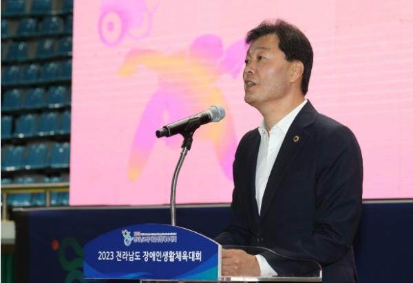 [중앙뉴스라인, 차행운기자] 전라남도의회 서동욱 의장은 14일 순천시 팔마체육관에서 열린 2023 전라남도 장애인생활체육대회 개막식에 참석했다.