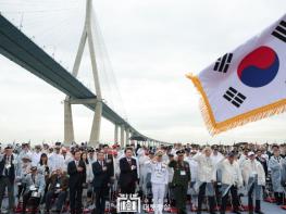 [중앙뉴스라인, 우제헌기자] 윤석열 대통령은 9월 15일 오전 인천항 수로를 항해하는 해군 상륙함 노적봉함에서 개최된 제73주년 인천상륙작전 전승행사를 주관했다. 현직 대통령이 인천상륙작전 전승행사를 주관한 것은 이번이 처음이며, 전승기념식과 상륙작전 시연 모두 움직이는 함선 위에서 진행된 것도 역대 최초이다.