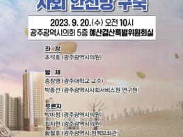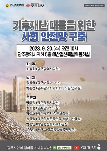 조석호 광주시의회 환경복지위원장을 좌장으로 송창영 광주대학교 건축학부 교수와 박종선 광주시사회서비스원 연구원이 각각 주제발표를 한다. 송 교수는 ‘가뭄과 극한호우·폭염·태풍 등 기후재난 대비 안전망 구축’, 박 연구원은 ‘새로운 사각지대로 떠오른 기후재난 취약계층 지원 시스템 구축’ 방안을 중점적으로 설명한다.