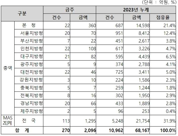 지역별 발주량을 보면, 총액계약 대상 801억 원 중 본청이 360억 원으로 44.9%를 집행하고 서울청 등 11개 지방청에서 441억 원을 각각 집행할 예정이다.