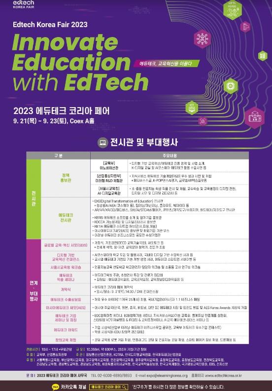 이번 행사는 '에듀테크, 교육혁신을 이끌다(Innovate Education with EdTech)'를 주제로 국내외 기업·기관의 다양한 에듀테크 제품·서비스를 만나볼 수 있는 에듀테크 전시관 이외에 정책홍보관, 국내기업을 위한 수출상담회 및 투자 유치설명회, 제8회 에듀테크 비즈니스모델 공모전 시상식 등 다채로운 프로그램이 진행될 예정이다.