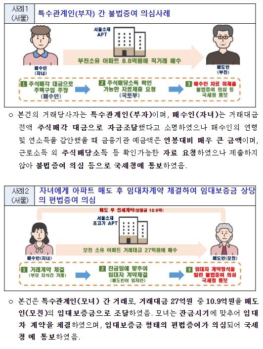 구체적인 위반사례는, 거짓신고 등 거래신고법 위반(134건) 외에 특수관계자 간에 직거래를 통한 편법증여 또는 차입금 거래 등 국세청 통보 건이 47건으로 다수 적발됐고, 명의신탁 등 경찰청 통보 건 8건, 대출용도 외 유용 등 금융위원회 통보 건이 12건이다.