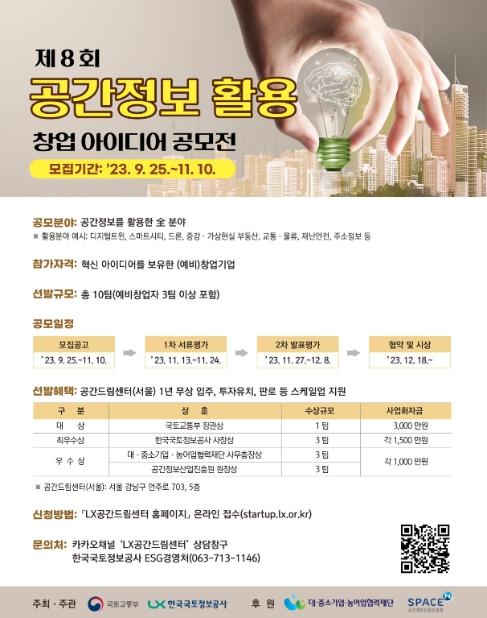 예비창업자 또는 7년 미만 창업기업이라면 누구나 LX공간드림센터 누리집을 통해 참여할 수 있으며, 서면심사 및 발표평가를 거쳐 총 10팀을 최종 선발하여 시상할 계획이다.