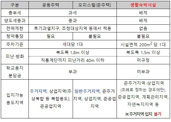 생숙을 주거용 오피스텔로 용도변경 시 2년간 한시 적용되던 특례는 추가연장 없이 10월 14일부로 종료된다. 이는 주차장·학교 과밀 등 인근 주민들의 역민원, 생숙을 숙박시설로 정상사용 중인 준법자와의 형평성을 고려한 것이다.
