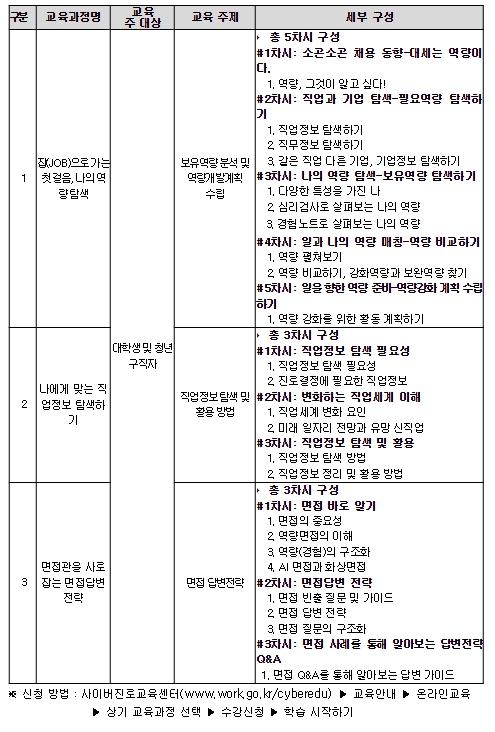 새로 개설된 교육과정은 ▲잡(JOB)으로 가는 첫 걸음, 나의 역량 탐색 ▲나에게 맞는 직업정보 탐색 ▲면접관을 사로잡는 면접답변 전략으로 모두 대학생과 청년 구직자를 대상으로 한다.