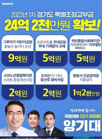 [중앙뉴스라인, 우제헌기자] 더불어민주당 양기대 국회의원(경기광명을)이 2023년도 1차 경기도 특별조정교부금 24억 2천만 원을 확보했다고 26일 밝혔다.