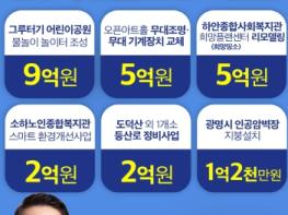 이번에 확보된 경기도 특조는 △그루터기 어린이공원 물놀이 놀이터 조성 9억 △오픈아트홀 무대조명 및 무대기계장치 교체 5억 △하안종합사회복지관 희망플랜센터 ‘희망띵소’리모델링 5억 △소하노인종합복지관 스마트 환경개선사업 2억 △도덕산 외 1개소 등산로 정비사업 2억 △광명시 인공암벽장 지붕설치 1억 2천만 등 6개 사업이다.