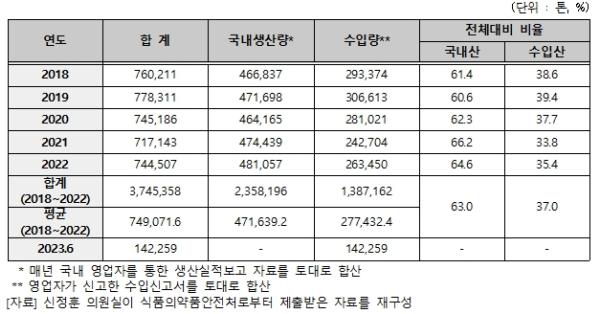 국회 농림축산식품해양수산위원회 신정훈 의원(더불어민주당·나주화순)이 식품의약품안전처로부터 제출받은 자료에 따르면, 최근 5년간(2017~2021년) 연평균 74만 9,072톤의 김치가 유통되고 있으며 이 중 중국산은 37.0%(27만 7,432톤)인 것으로 확인됐다.