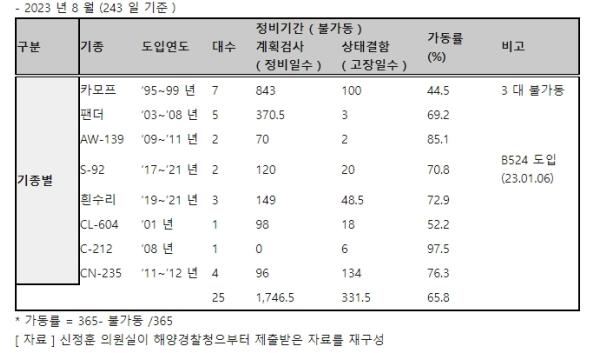 국회 농림축산식품해양수산위원회 신정훈 의원 ( 더불어민주당 · 나주화순 ) 이 해양경찰청으로부터 제출받은 자료에 따르면 , 올해 8 월 (243 일 ) 까지 해경 보유 항공기들이 정비 , 고장으로 가동할 수 없는 날이 평균 83 일 (34.2%) 인 것으로 확인됐다 .