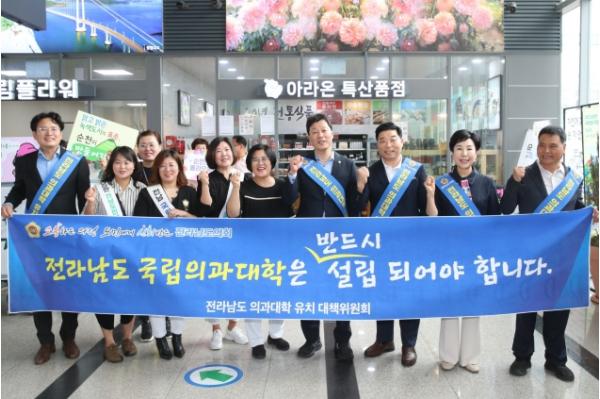 전남도의회 ‘전라남도 의과대학 유치 대책위원회’를 주축으로 진행된 이날 캠페인은 순천역과 목포역 두 곳에서 진행됐으며 순천?목포시의회 의원과 사회단체 등 170여 명이 동참했다.
