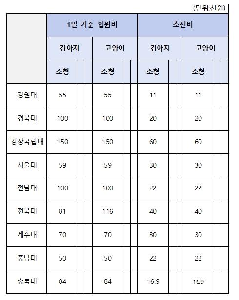 소형견 기준 강원대병원 1만1000원으로 가장 저렴했으며, 경상국립대병원이 6만원으로 가장 비싼 것으로 조사됐다. 대학별로 강원대 1만1000원, 충북대 1만6000원, 경북대 2만원 전남대?충남대 2만2만천원, 서울대?제주대 3만원, 전북대 4만원, 경상국립대 6만원 순이었다.