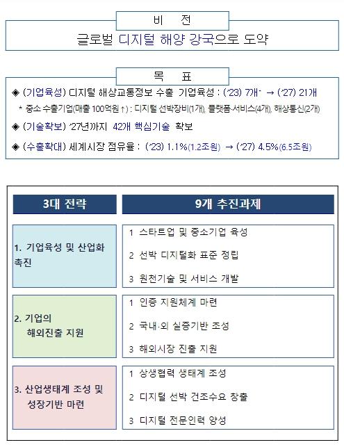 이에 정부는 국제적인 경쟁력을 갖춘 강소 수출기업 육성과 6.5조 원 규모의 부가가치 창출을 목표로 디지털 해상교통정보산업을 발전시키기 위한 정책을 마련하여 추진한다.