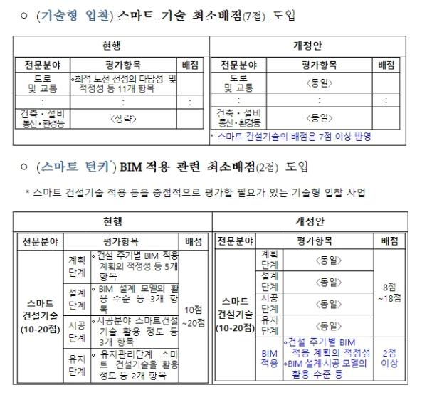 단독 응찰업체 평가 방법·절차 신설, 스마트 건설기술 관련 최소배점 도입 등