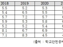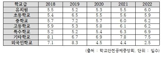 학교안전공제회로 접수되는 사건도 늘어났다. 2018년 요양급여를 받기 위해 학교안전공제회로 접수된 건수는 7만 5,270건이었으나 2022년에는 8만 3,232건으로 증가했다. 특히 중학교의 경우 접수건수가 2018년 22,349건이었으나 2022년에는 29,196건으로 크게 증가했다.