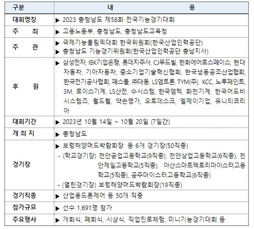 고용노동부, 충청남도, 충청남도 교육청이 공동주최하고 한국산업인력공단과 충청남도 기능경기위원회가 함께 준비한 ?제58회 전국기능경기대회?는 전국 1,691명의 시·도 대표선수들이 참가해 ‘백제의 숨결 속, 당신의 기술 충분히 남다르다’라는 표어 아래 그간 갈고닦은 기량을 겨룬다.