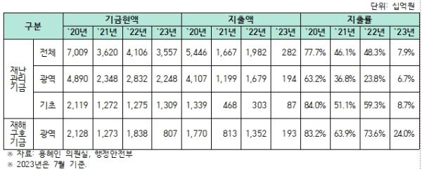 지방정부는 코로나19 확산 첫 해인 2020년 재난관리기금 7조91억원, 재해구호기금 2조1280억원 가량을 적립하고 이 중 80% 가량 지출했다. 그 후 3년간 기금현액 수준은 3~4조 수준으로 유지됐지만, 올해 코로나19 확산이 크게 줄어들면서 지출액이 크게 감소했다.