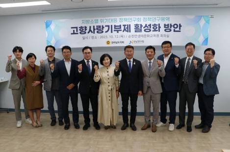 [중앙뉴스라인, 차행운기자] 전라남도의회 의원 연구단체 ‘지방소멸위기대응 정책연구회’가 지난 10월 12일 순천만생태문화교육원 회의실에서 연구용역 최종보고회를 개최했다.