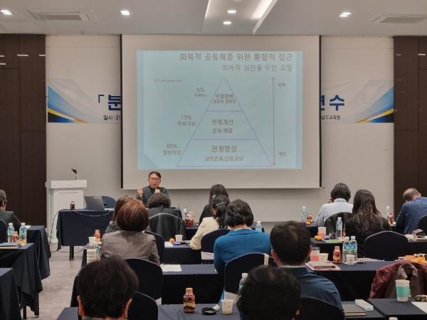 심의위원회 분쟁조정 위원과 학교폭력 업무담당자, 상담교사 등 60여 명을 대상으로 한 이번 연수는 학교폭력 사안 처리 과정에서 갈등 해결 및 분쟁조정 전문역량을 강화하기 위해 마련됐다.