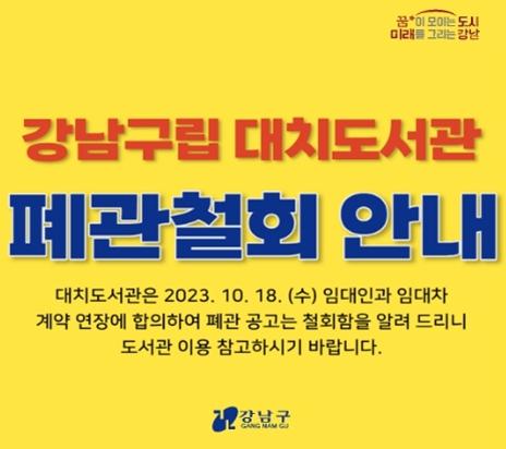강남구는 10월 19일, 대치도서관 홈페이지를 통해 폐관 철회 안내문을 올리고 임대인과 임대차 계약 연장에 합의하여 폐관 공고를 철회함을 밝혔다.