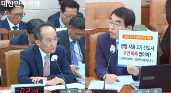 이에 추경호 경제부총리 및 기획재정부 장관은 “광명·시흥 3기 신도시의 토지보상은 절차이행에 시간이 소요되는 것”이라며 “보상절차가 마무리되는 대로 LH가 토지손실보상을 성실하게 진행할 수 있도록 하겠다”고 답했다.