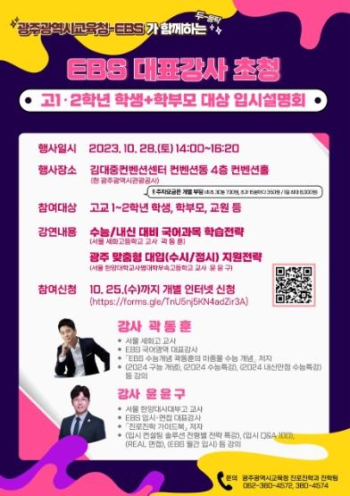 또 서울 한양대학교사범대학부속고등학교 윤윤구 선생님은 EBS 입시·면접 대표강사로 ‘입시 컨설팅 솔루션 전형별 전략 특강’, ‘입시 Q&A100’, ‘REAL 면접’, ‘EBS 월간입시’를 강의하고 있으며 현재 EBS 입시 및 면접 대표강사로 활동 중이다. 이번 설명회에서는 2025·2026학년도 대입 일정별 대응 전략과 2025·2026학년도 광주 맞춤형 입시 지원 전략을 안내한다.