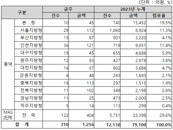 지역별 발주량을 보면, 총액계약 대상 852억 원 중 본청이 45억 원으로 5.3%를 집행하고 서울청 등 11개 지방청에서 807억 원을 각각 집행할 예정이다.