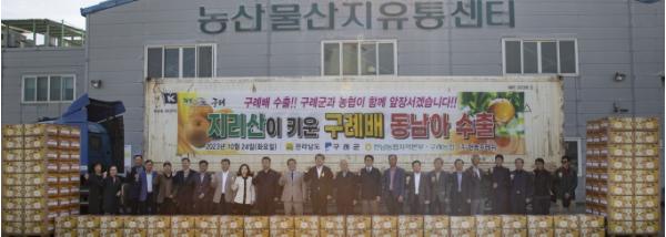 농산물 국내 가격 안정과 농가 소득 증대를 위해 적극적인 수출 장려 정책을 펼치는 구례군은 구례군 의회, 구례농협 임직원과 생산농업인과 함께 2023년 10월 24일 구례농협산지유통센터(APC)에서 구례 배 베트남 수출 상차식을 가졌다.