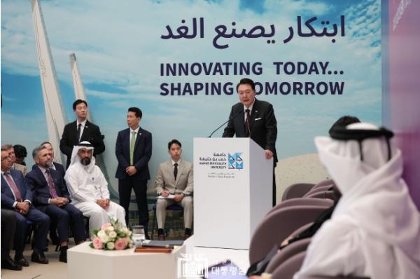 [중앙뉴스라인, 우제헌기자] 윤석열 대통령은 오늘(현지시간 10. 25, 수) 오후 카타르 에듀케이션 시티에 위치한 연구 중심 대학인 하마드 빈 칼리파 대학교(HBKU)에서 개최된 '청년 리더와의 대화' 행사에 참석했다. 대통령은 해외 순방 때마다 그 나라의 학술연구와 혁신을 선도하는 대학을 방문해 청년들과 소통하고 있다.