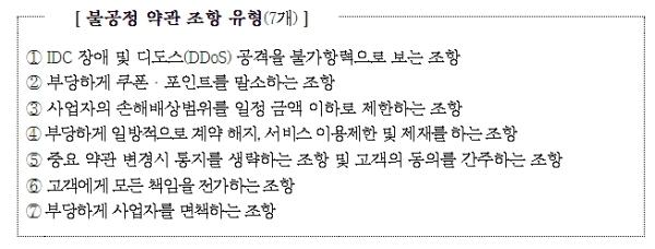 주요 불공정 약관은 먼저, IDC 장애 및 디도스(DDoS) 공격을 불가항력에 준하는 사유로 보아 사업자가 전혀 책임지지 않도록 하는 조항이 있었다.