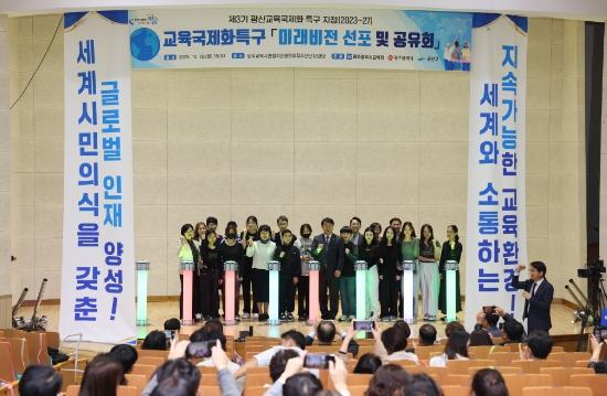 이날 행사는 월곡중학교 학생들의 K-POP 공연을 시작으로 이정선 교육감과 오영걸 광산부구청장의 인사말, 축사, 미래비전 선포 및 공유회 순으로 진행됐다. 특히 광산교육국제화특구 비전인 ‘세계시민의식을 갖춘 글로벌 인재 양성’을 알리고 핵심과제인 ▲세계시민교육 플랫폼 구축 ▲세계시민교육 ▲글로벌 교원 육성 ▲공존·상생의 글로컬 교육 등에 대한 설명이 있었다.