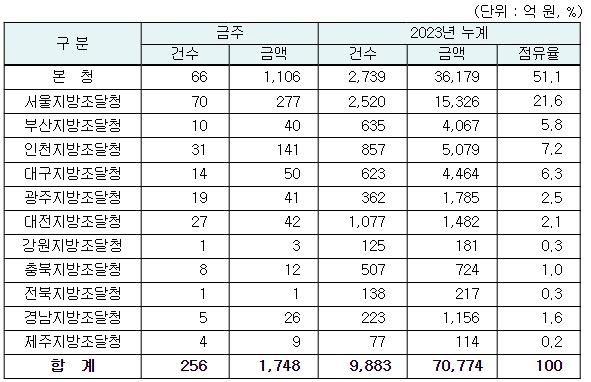 지역별 발주량을 보면 대전광역시 소재 본청 1,106억 원, 서울지방청 277억 원 등 2개청(1,383억 원)이 전체 금액(1,748억 원)의 79.1%를 차지하고 있으며, 인천 등 나머지 10개 지방청 365억 원이 각각 집행될 예정이다.