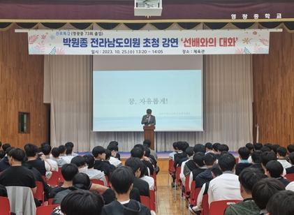 [중앙뉴스라인, 차행운기자] 전라남도의회 기획행정위원회 박원종 의원(더불어민주당, 영광1)이 지난 10월 25일 모교인 영광군 영광중학교를 찾아 후배들과 ‘꿈. 자유롭게!’ 라는 주제로 진솔한 대화를 나눴다.