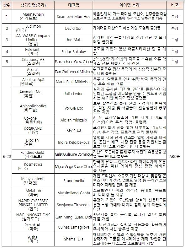 이날 시상식에서 상금 12만달러를 받는 1위조(팀)은 싱가포르의 ‘마리나체인(MarinaChain)’이, 2위조(팀)은 미국의 ‘럭몬(Luckmon)’이, 3위조(팀)은 홍콩의 ‘애니웨어(ANIWARE Company Limited)’가 차지했다.