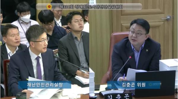 [중앙뉴스라인, 이승훈기자] 서울시의회 윤리특별위원회 위원장과 도시안전건설위원회 위원으로 활동 중인 김춘곤 의원(국민의힘, 강서4)은 2일 제321회 정례회 상임위 소관 재난안전관리실 2023년 행정사무감사에서 투수블록 기능 복구 청소 확대 및 중대재해감시단 운영 등 시민의 안전과 밀접한 사안에 대해 질의하고 개선을 주문했다.