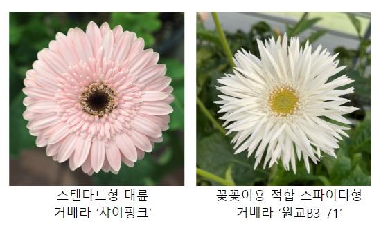 농촌진흥청은 이런 유통 경향을 반영해 개발한 화환용 거베라 대륜형 ‘원교B3-69’와 꽃목 고정 작업이 필요 없는 ‘원교B3-71’, ‘원교B3-72’ 등 20계통을 소개한다.