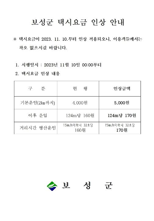 [중앙뉴스라인, 김병연기자] 보성군은 오는 10일부터 중형 택시 기준 기본요금을 5,000원으로 인상한다고 밝혔다.