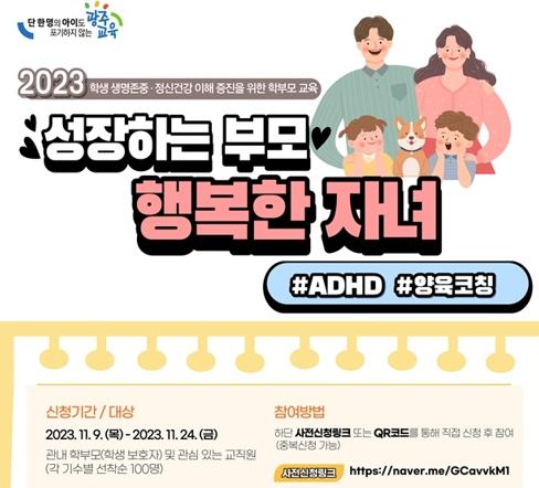 9일 시교육청에 따르면 이번 교육은 학부모에게 자녀의 정신건강 및 양육에 대한 교육을 통해 아동·청소년 정신건강에 대한 인식개선을 유도하고자 마련됐다.