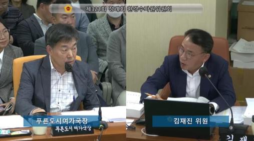 김재진 의원은 여의도공원이 평소 주민들의 이용이 많고, 자전거 순환길, 농구장, 운동시설 등의 이용률도 높으며, 점심시간 식사후 산책과 휴식을 즐기는 직장인들로 붐비는 공원임을 강조했다. ‘서울의 달’이 기존 공원이용객들을 방해하는 부분은 없는지, 근린공원으로서 맨발황톳길 같은 휴식공간을 확보하는 것이 바람직한데 관광에 치우친 것이 아닌지 우려했다. 또한 장기적으로는 제2세종문화회관도 계획되어 있어 앞으로 여의도공원이 공원으로서 휴식을 위한 정체성을 잃지 않도록 긴밀하게 협력하고 검토할 것을 당부했다.