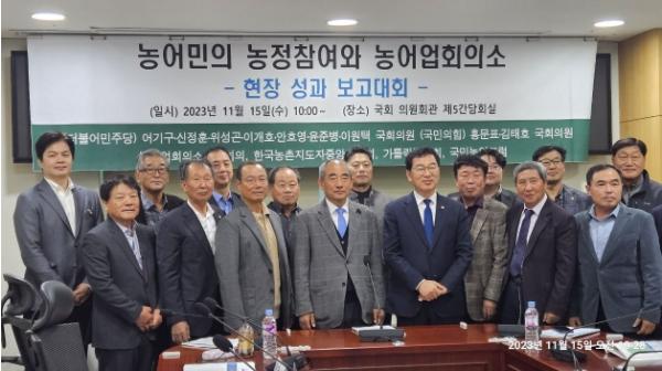 이날 9시 20분 국회 소통관에서 열린 기자회견은 11월 정기국회에서 농어업회의소법 제정을 촉구하고, 제정의 당위성을 국민과 농어업인에게 호소하기 위해 마련됐다. 어기구, 신정훈, 홍문표, 위성곤, 이개호, 안호영, 김태호, 윤준병, 이원택 국회의원과 한국농촌지도자중앙연합회, 가톨릭농민회, 농어업회의소전국회의가 공동주최했다.