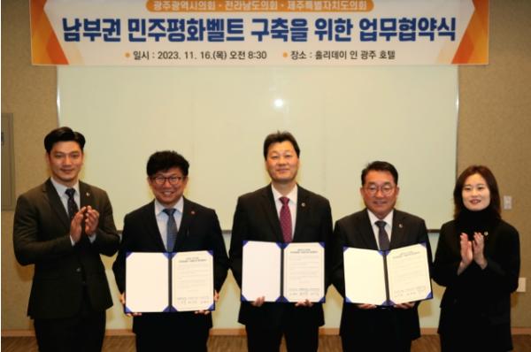 [중앙뉴스라인, 차행운기자] 전라남도의회는 16일 홀리데이인 광주 미팅룸에서 광주광역시의회, 제주도의회와 함께 ‘남부권 시?도의회 민주평화벨트 구축을 위한 업무협약’을 체결했다고 밝혔다.