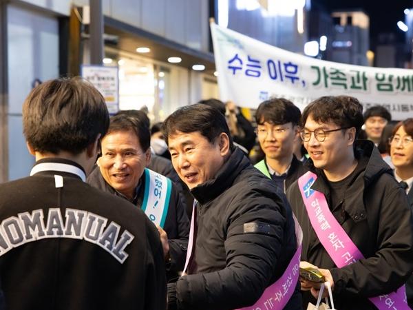 [중앙뉴스라인, 김병연기자] 이정선 광주시교육감이 수능 당일인 지난 16일 저녁 수능을 마친 학생들을 위해 학교폭력 예방 거리 캠페인을 펼쳤다.