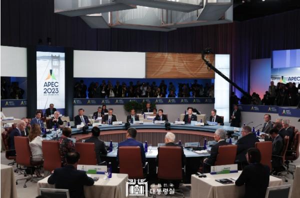 [중앙뉴스라인, 우제헌기자] 미국 샌프란시스코에서 개최 중인 제30차 APEC 정상회의에 참석하고 있는 윤석열 대통령은 오늘(현지시간 11. 17, 금) 11:00-12:30간 개최된 두 번째 세션인 리트리트(주제 : 상호연계, 포용적이고 회복력 있는 경제 만들기)에 참석했다. 대통령은 세계 경제의 변곡점에서 APEC에 주어진 역할을 강조하고, 푸트라자야 비전 2040 실현을 위해 긴밀히 연대하며 포용적이고 회복력 있는 경제를 함께 만들어 나가자고 촉구했다.