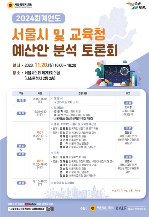 [중앙뉴스라인, 이승훈기자] 서울특별시의회는 2023년 11월 20일 오후 4시부터 서울시의회(서소문청사 제2동 제2대회의실)에서'2024년도 서울시?교육청 예산안 분석토론회'를 한국지방재정학회와 공동으로 개최한다.